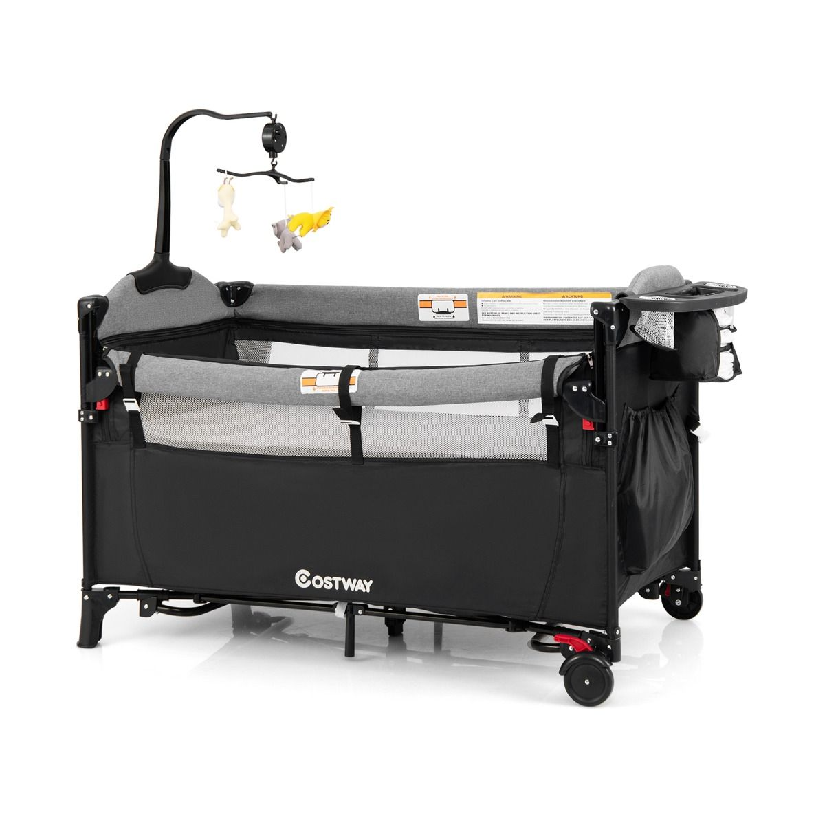 This 5-in-1 baby bassinet with a removable mattress, a diaper table and a zippered door meets all your baby's needs, from sleep, diaper changes to play. It is suitable for a baby aged 0-3 years. The bedside sleeper mode with a 4-level height adjustable side armrest makes it fit most adult beds, keeping your baby at an arm's reach for easy feeding throughout the night. The cradle mode is helpful to lull the baby into a peaceful sleep. Moreover, the side storage basket, which can be mounted in different places on the crib rails based on your need, keeps everything organized. The lockable wheels make it easy to move around. In addition, this baby bassinet is ideal for travel with the foldable design and a convenient carry bag. Please note: the rocking bar must be removed first before folding the bed.